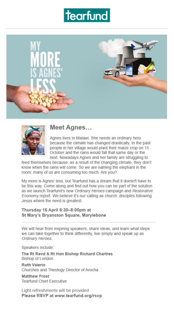 | 16 April at 6.30pm | LONDON St Mary’s Church, York Street, London, W1H 1PQ Please RSVP. | The Bishop of London, Richard Chartres Dr Ruth Valerio (Churches and Theology Director A Rocha UK) Matthew Frost (CEO Tearfund) |