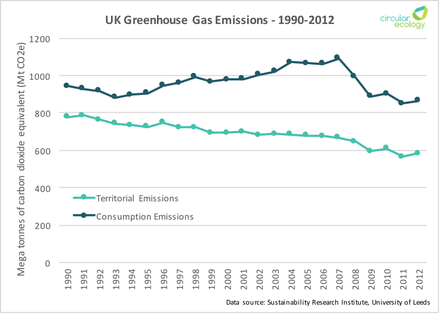 The Sustainability Research Institute at the University of Leeds has calculated Britain’s consumption emissions versus our territorial emissions. This is the result:
