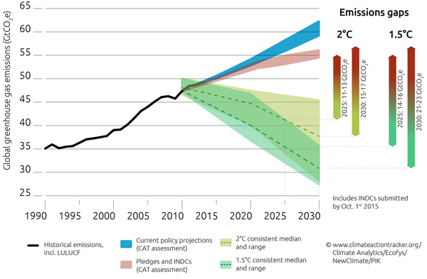 But the important thing is that once everyone’s contributions are added up, it will be enough to keep warming below 2 degrees. And the bad news there is that it won’t – not even close. As this graph from Climate Tracker shows, there is a huge ‘emissions gap’ between what’s needed and what’s being offered.