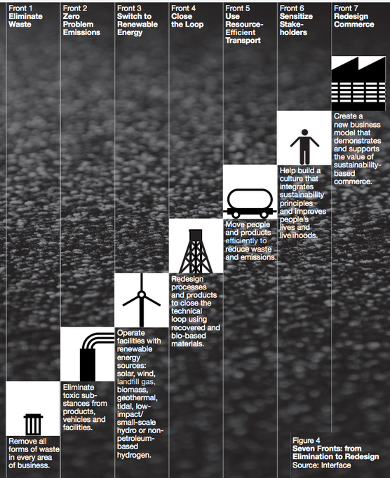 Anderson worked with some of the best minds in the sustainability world, and over time developed a story about where he wanted Interface to go. He imagined a mountain to climb, and identified seven fronts to Mount Sustainability.