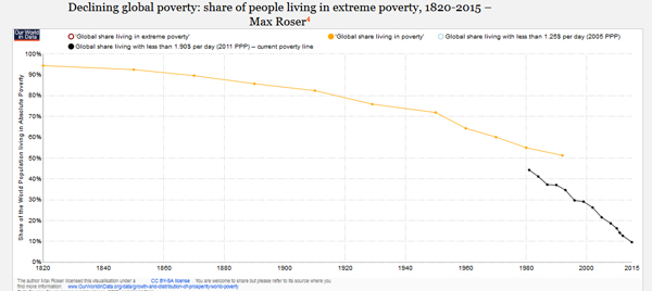 There is no single data-set going back 200 years, so it’s not a perfect comparison, but the message stands: huge progress has been made. In my own lifetime the number of people living in poverty has fallen from 55% to 10%.