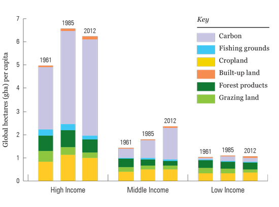 I’ll come back to the report when I’ve read it, but here’s one of those graphs. These are the differences in ecological footprints between high, middle and low income countries. As a reminder, the one planet sustainable share is 1.5 hectares per capita.