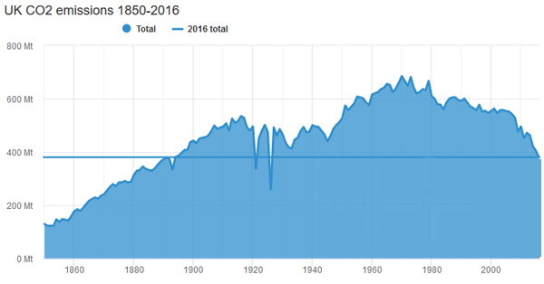 Given it’s global emissions that matter, it’s instructive to put this into a wider context – for example, by comparing the UK with India. As your chart shows, the UK has reduced its CO2 emissions by over 30 percent since 1990 (even more since 1970). India in contrast, whose emissions were much the same as the UK’s in 1990, has increased its emissions by nearly 300 percent since then.