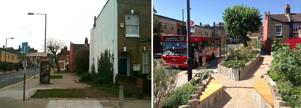 Or this one, which inspired the whole idea. Residents have been gardening this little patch alongside a bus-stop since 2011, and it now has benches, beds made from recycled kerb stones, and lots of herbs and fruit trees.