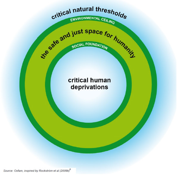 You may remember the doughnut, an innovative framing of social and environmental challenges that I’ve written about a number of times over the last few years. It’s the brainchild of Kate Raworth, who saw that if the planetary boundaries form a kind of upper limit that we shouldn’t exceed, there’s also a social foundation that we shouldn’t fall below. When put together you get a doughnut, a ‘safe and just space for humanity’ (see image at the bottom of the post for a reminder).