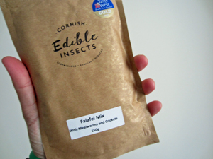 I have a few more things in the post, and I’ll get to them in due course. For today, let me tell you about a small British company called Cornish Edible Insects. Cornwall has built up something of a reputation for good food and for sustainability, so it’s a good place to be based. Started in 2015, Cornish Edible Insects has a small range of products so far, and the one that caught my eye as a unique idea is their falafel mix with mealworms and crickets. I like a good falafel, and this particular product had won gold at the Taste of the West awards, so it looked like a good bet.