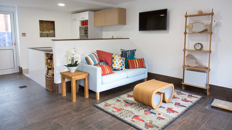 - Sockets have been raised, and wiring has been done from the ceiling down. The TV is wall-mounted, and the fridge sits on a concrete plinth.