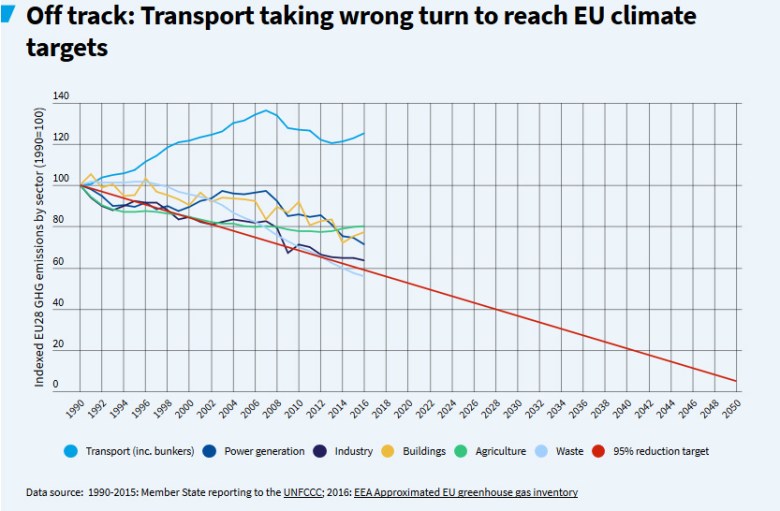Aside from waste, none of the sectors are exactly on track, but most are headed in the right direction. All except transport, which is off on its own merry way. It’s a similar story to Britain, where the transport sector is the slowest to decarbonise.