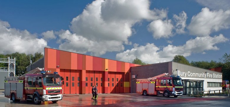 This is Bury Community Fire Station. It’s a new build which is sufficiently insulated that its gas bills are just 10% of the of the old fire station’s. There’s a solar PV array on the roof, and solar heating and hot water. There are two water harvesting systems, one on the roof and one in the training area, capturing water for flushing toilets and washing down vehicles.