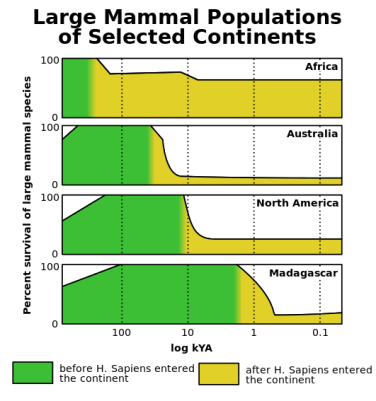 Human impacts go back a long way, well before the industrial revolution, and the book spends several chapters tracking them. Our first planetary change was while humans were still hunter-gatherers. With cooperative hunting techniques and weapons, early humans wiped out large land animals everywhere they went. Mammoths and elephants, hippos and rhinos all vanish from record as humans enter it. Africa suffered the fewest extinctions, which is why we think of these creatures as African animals today. Altogether the authors estimate that a billion large animals were slaughtered for meat, and “megafauna absence can restructure whole ecosystems.”