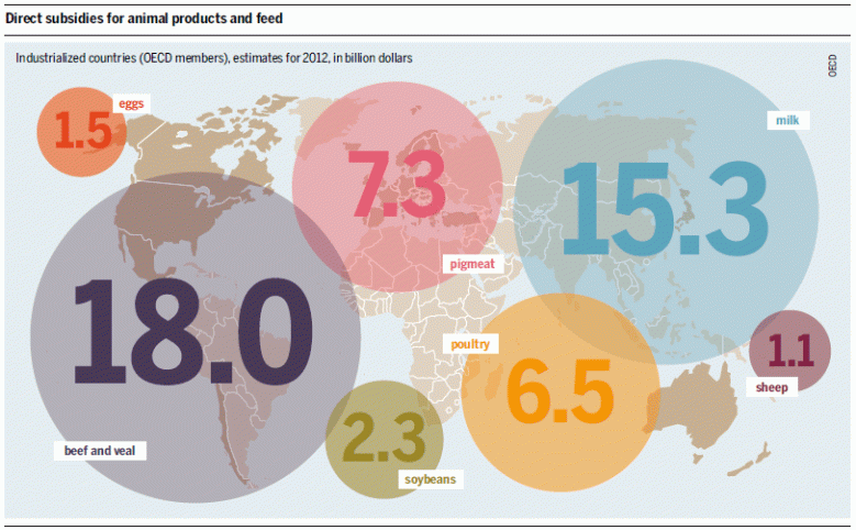 Lots of countries use agricultural subsidies of one kind or another, perhaps making fertiliser or equipment cheaper, or reducing the costs of water and irrigation. The EU, the United States, and a number of others subsidise livestock and feed. Taken together, OECD subsidies for animal products add up to tens of billions of dollars of taxpayer support, as this graphic from the Meat Atlas shows: