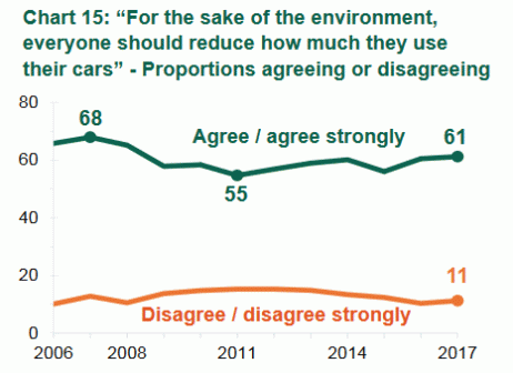 In some cases, the trends are changing in the wrong ways. People’s perception of cycling safety is unchanged over seven years, with 62% thinking the roads are not safe to cycle on. Fewer people agree that they could cycle rather than drive short distances. That’s clearly something to work on. Reflecting the sterling work of aviation lobbyists, more people back the right to fly, even if airports have to be expanded. It will be interesting to see if the Heathrow decision changes that in the 2018 figures.