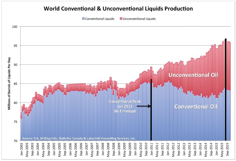 1. The thing is that if you look at your graph above the trend on conventional oil is basically flat. Not really a peak and then decline but pretty static in the region of 80-85 million barrels a day. Not really peak there either.