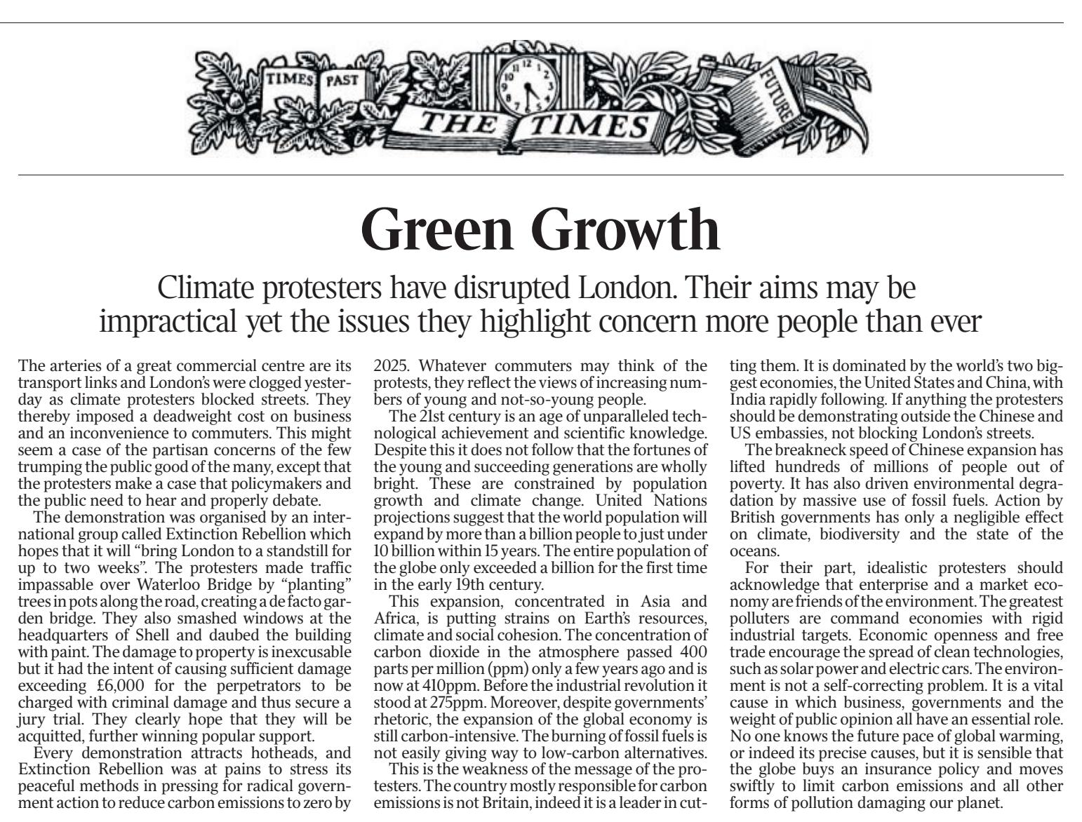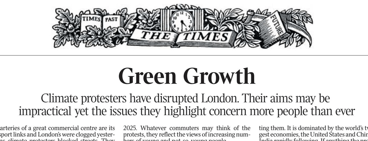 The piece was called ‘The Times view on climate protestors: Green Growth’. It’s here without the paywall if you want to read it first. It acknowledges that we should “move swiftly to limit carbon emissions”, which is encouraging, but there are several important features to the argument that I wanted to highlight: