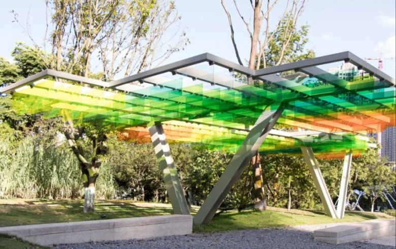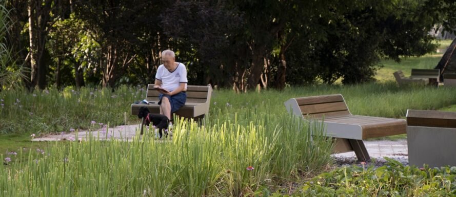 There are clusters of benches, colourful canopies, play areas and green spaces. The visual clutter of the road has been removed, including curbs and road markings. The architect describes it as reimagining the highway “as a continuous urban park through which vehicles can move.”