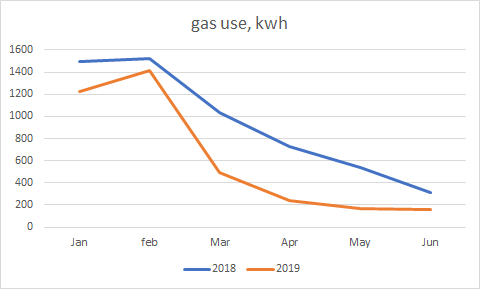 I began monitoring our energy more carefully in 2018 so that I can measure our progress. It’ll be a while before we can really see the difference, but this week I got our annual energy use summary from Ecotricity. They measure it from the middle of the year, so we can compare our 2017-18 energy use with 18-19.