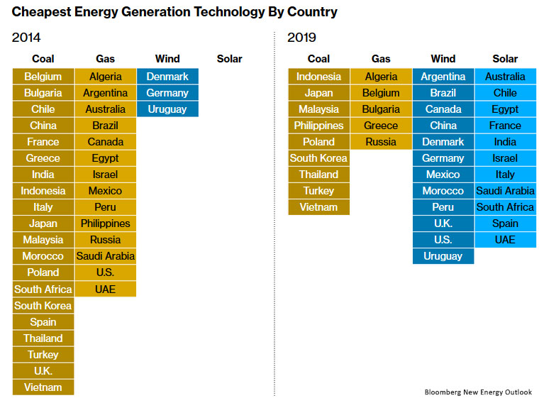 Here’s a striking graphic from Bloomberg’s New Energy Outlook. It shows the cheapest form of energy in a series of countries, in 2014 and today. A lot can change in five years.