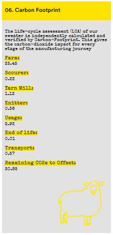 On the subject of supply chains, it’s worth asking what the carbon footprint might be of a jumper that has gone from New Zealand to China to Italy to Spain to me in Luton. And helpfully, my jumper’s full account of itself also includes its carbon footprint. Transport is actually a relatively small component of that total of 30.85 kg, which Sheep Inc will offset ten times through their biodiversity and reforestation projects.
