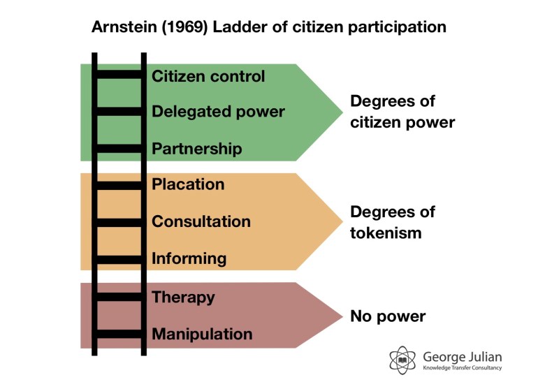 At the top of the ladder comes the more democratic processes of partnership, delegated power and even empowered citizens driving the process themselves.