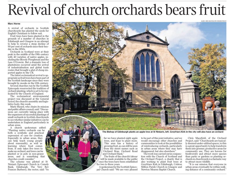 A project to revive the tradition of churchyard orchards in Scotland has been picked up for replication by the Church of England, according to the Telegraph. I mention this because I like it, but also because it’s my brother Paul’s idea, and he organised the pilot project in churches in Edinburgh and Glasgow.
