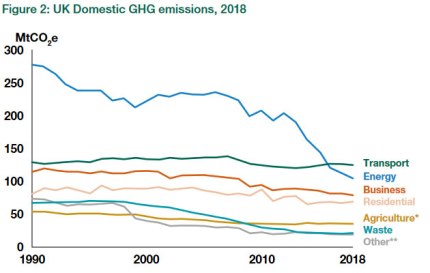 Britain’s carbon emissions continue to fall – the provisional 2019 figures were out last week and showed a 3.6% drop on 2018. As I’ve explored before, this has been driven by renewable energy replacing coal for electricity, with emissions from electricity falling by 62% since 1990. That progress is not shared across every sector though: transport emissions have registered a tiny 4.6% reduction over that same three decades, and have been rising in recent years. In 2016 transport overtook energy to become the most polluting sector of the economy.