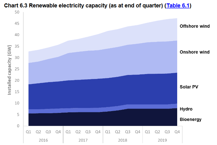 Britain’s electricity supply is undergoing an impressive transformation from fossil fuels to clean energy. Wind is the cheapest and biggest contributor, with rising amounts of solar on the grid. You’ve also got a growing bioenergy sector. Here’s how capacity currently breaks down, from the government’s latest quarterly update: