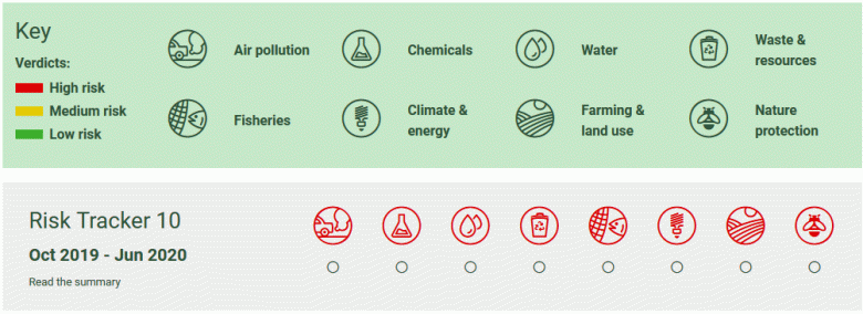 Greener UK, a coalition that includes just about every environmental organisation you could think of in the country, has been tracking progress in Brexit policy over the last few years. They have been publishing a risk tracker showing which areas of the environment are likely to be protected, and which ones are at risk. It tracks plans for air pollution, chemicals, water, waste and resources, fisheries, climate and energy, farming and land use, and nature protection. Each sector is graded high, medium or low risk, and assigned a colour.