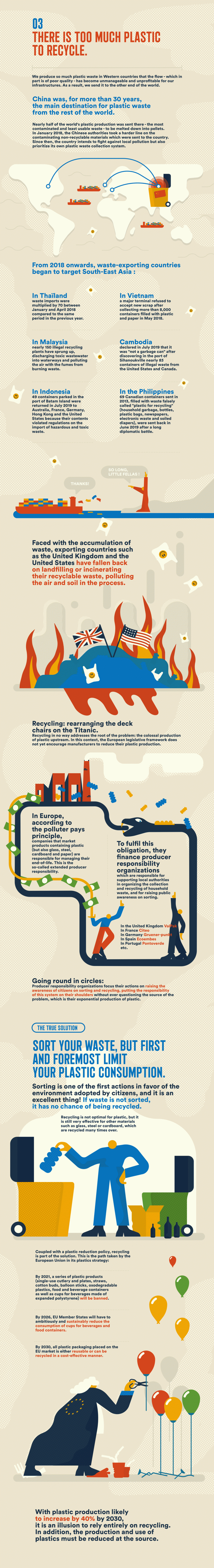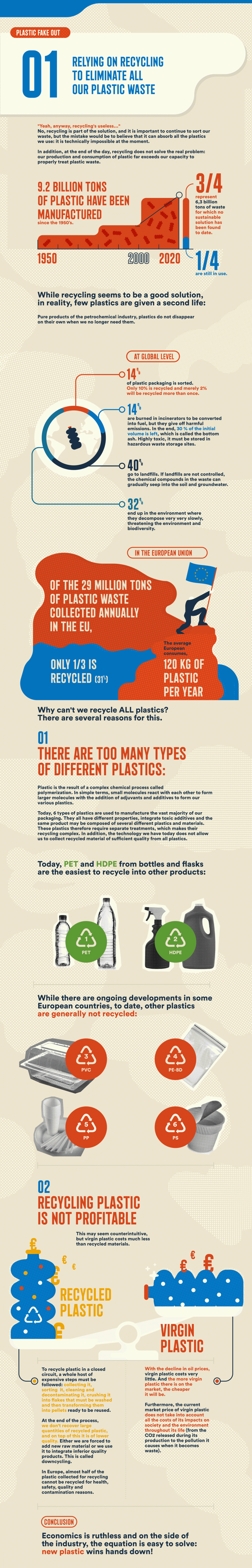 I don’t normally post infographics, but I was sent a set of them from Surfrider Foundation Europe last week. I thought they were unusually detailed and clear presentations of some of the problems around plastic, especially the false solutions that keep cropping up as people become more aware of plastic. False solution number one is recycling – obviously useful, but obviously not enough when you do the maths.