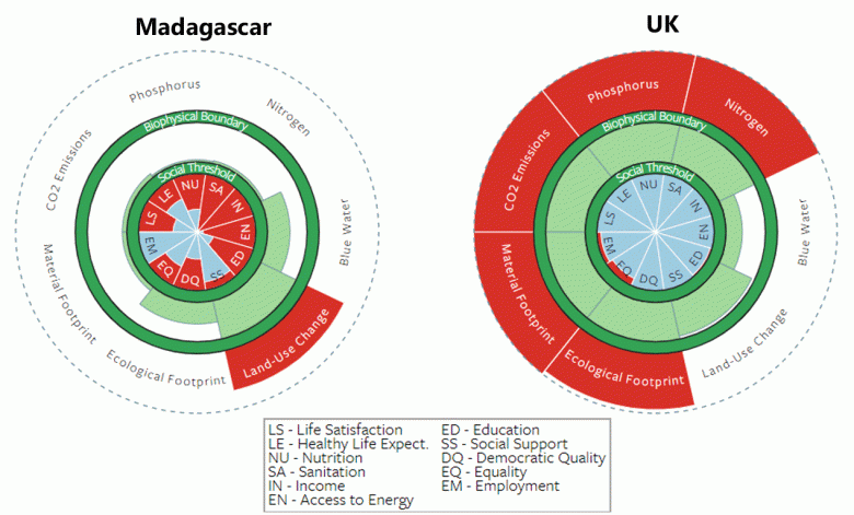 Drawing on the national examples compiled at Leeds University, we can compare the doughnuts for Madagascar and Britain:
