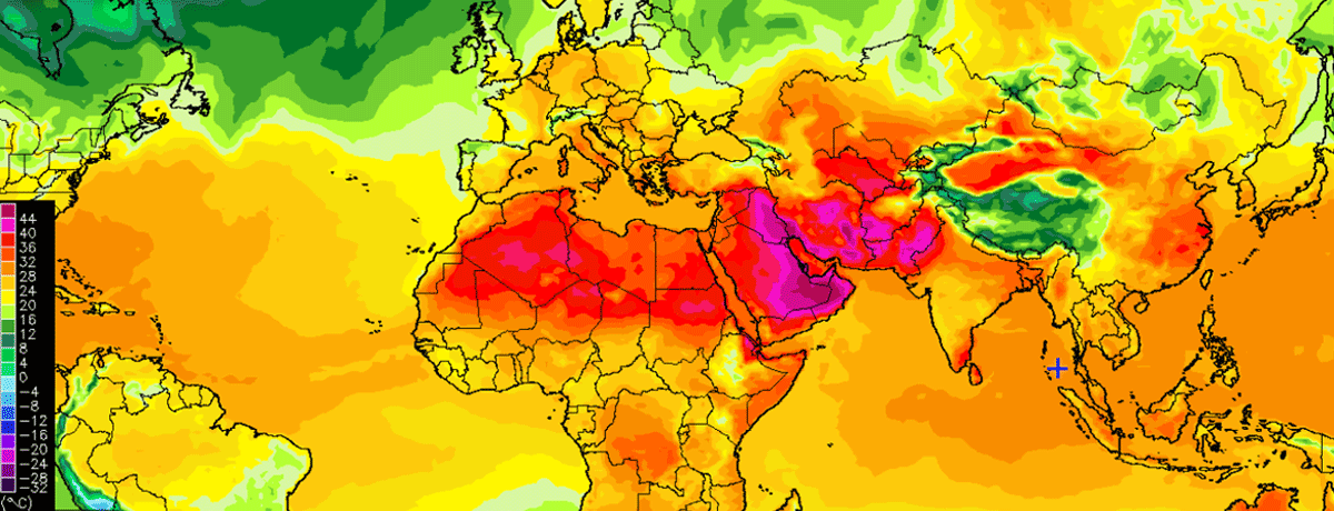 When we Brits talk about heatwaves we mean temperatures that reach as high as, you know, 34 or 35 degrees celsius. These are not temperatures that will illicit much sympathy from readers in more Equatorial regions. To put things in perspective, here’s a global map of temperatures right now: