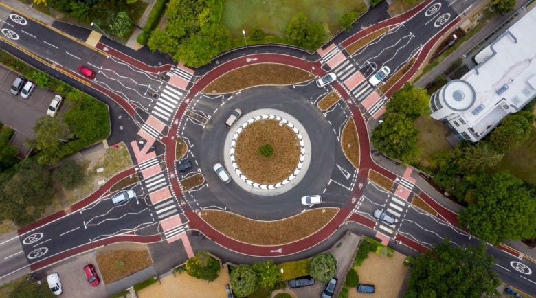 Drivers slow down and give way to pedestrians, then to cyclists and then to other cars, both on entering and exiting the roundabout. It’s best understood with an aerial shot, which also shows off the flow through those concentric circles of traffic.