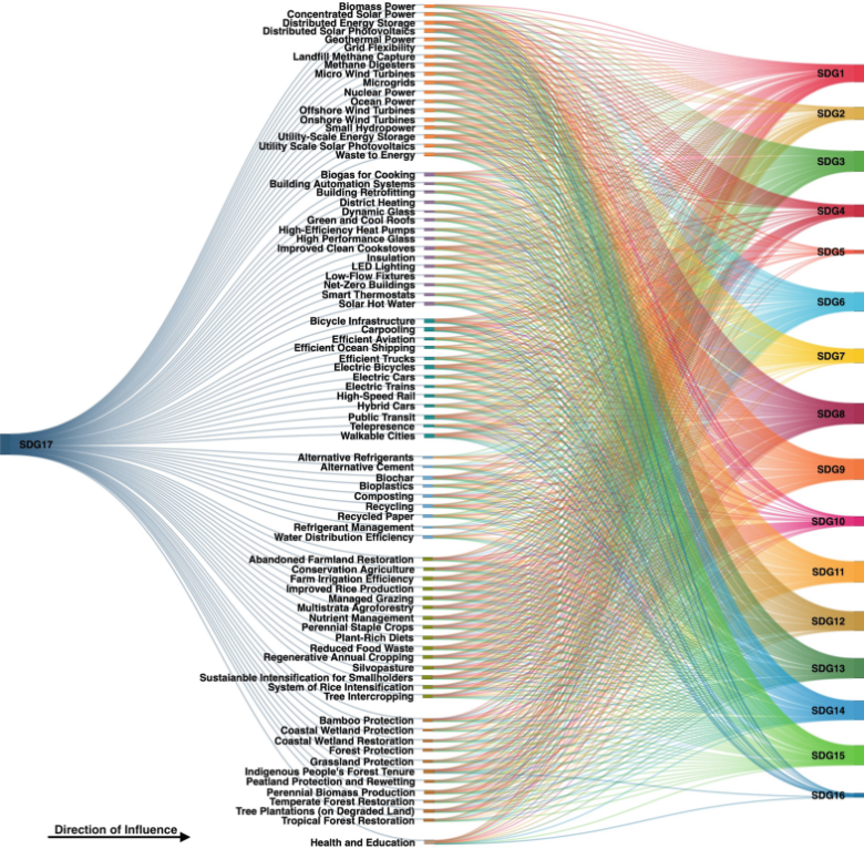 An image for you. This is how the 50 climate change reversal ideas from the Drawdown Project map onto the Sustainable Development Goals, as described in this research paper.