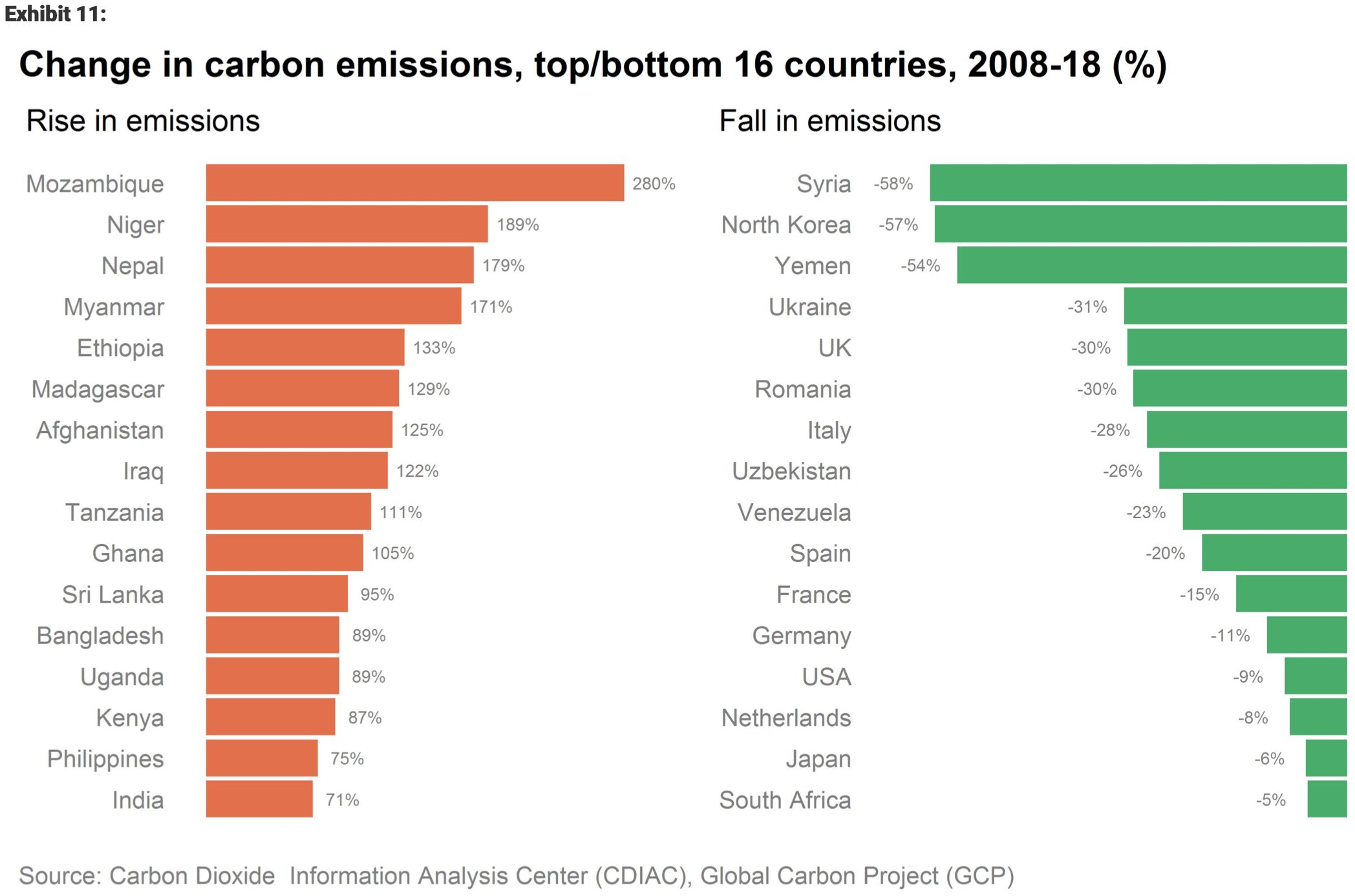 Here’s a graph that caught my eye recently, posted on Twitter by David Roberts of Vox. It’s from a Morgan Stanley report that I don’t have access to, so apologies for not providing a linked source. It shows the 16 countries where carbon emissions have fallen fastest between 2008 and 2018, and the 16 countries where they have risen fastest.