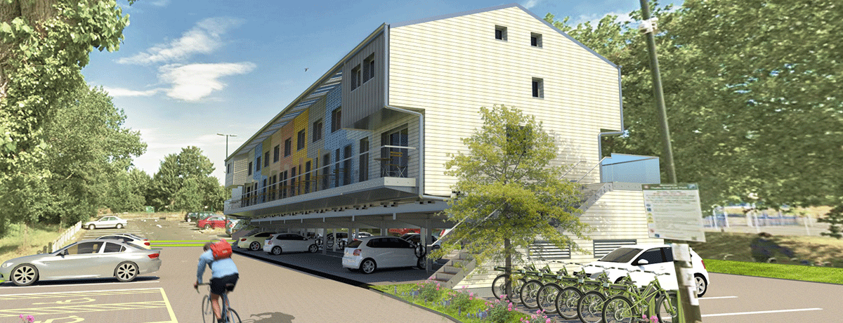 We very nearly got to see the first commercial application of the idea in nearby Dunstable, until local spoilsports lodged their objections. Instead, here’s a project from Bristol. Hope Rise is a 100% affordable housing, zero carbon development and the first of its kind in the country. A set of 11 ZedPod homes has been installed above a car park next to a skate park, and it will house young people in partnership with the YMCA.