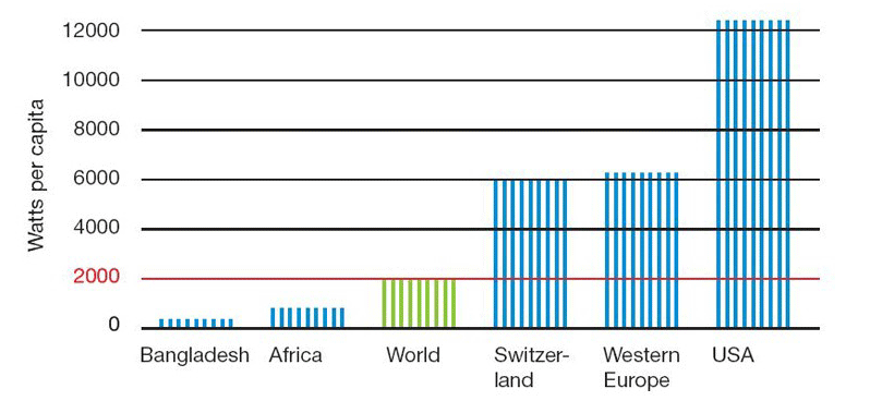 As the graph shows, there is huge inequality in energy use. Americans use over 12,000 watts, while usage can fall as low as 300 in Bangladesh. 2,000 watts is point of convergence – over-consumers can reduce their energy use towards that share, while others in developing countries can expand their usage to meet it.
