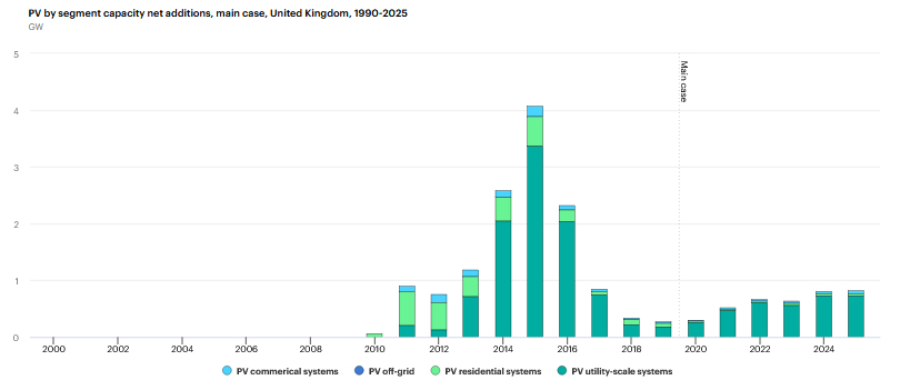 Still, I’m not against investigating it. There’s no harm in thinking decades ahead, and a little government funding at this point could support some useful science. However, what annoys me is the failure, once again, to invest in the proven technologies we already have. This graph shows net additions in solar generating capacity in Britain for the last ten years, and projected growth for the next five years: