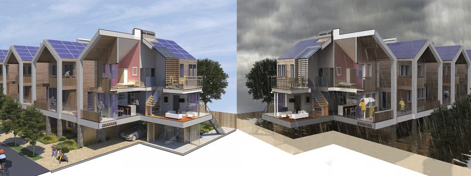 The Home for All Seasons is such a design, the winning proposal in the 2016 Resilient Homes Competition. The most obvious feature of the homes is that the ground floors hold garages and garden rooms, designed to flood without compromising living space or services. All the utilities run through the deck, keeping them safely above flood levels. The warmth from the cables and piping also melts snow that falls on the footpath, as an added bonus.