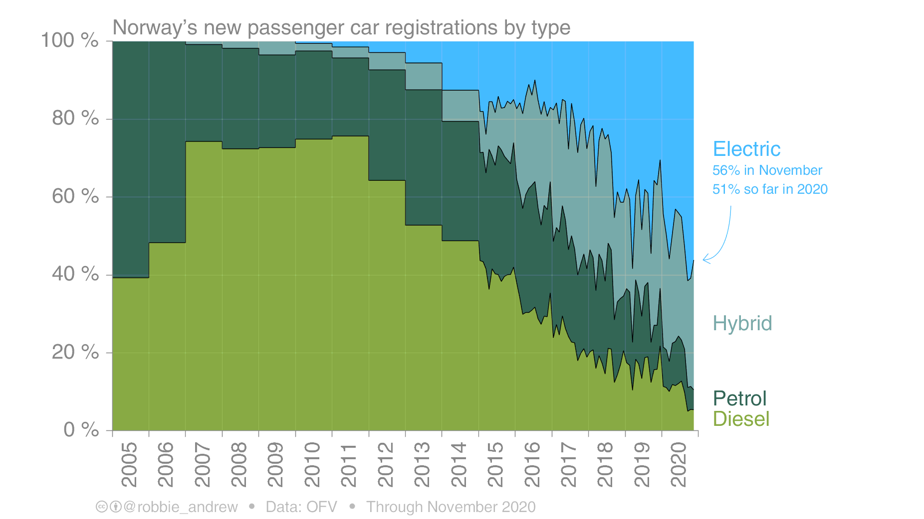 This graph of new car sales in Norway, posted by Robbie Andrew on Twitter, shows how pure petrol or diesel cars are now very much a minority interest. This is a dramatic shift in a decade, and the kind of thing I would hope to see in Britain in the coming years – alongside an overall decline in car sales and increased public and active transport, naturally.
