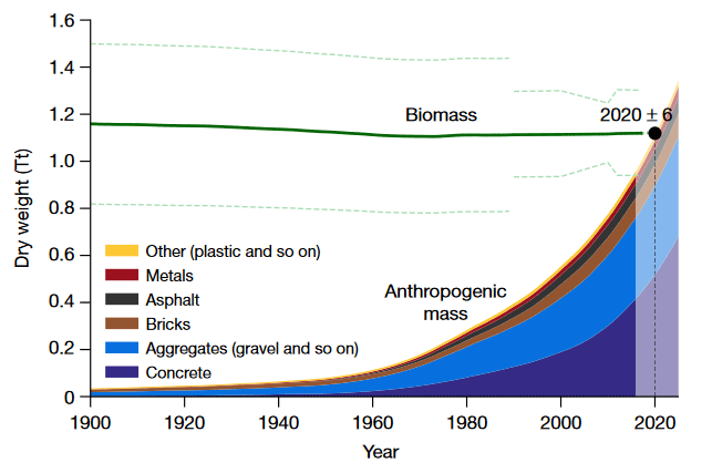 On the other side is the ‘anthropogenic mass’, which is the stuff created by human activity. The biggest component is concrete, and then aggregates such as sand and gravel. Metals, wood, glass and plastic are also included. The total weight of human resources has been doubling every twenty years, and 2020 is the year that they weigh the same as the natural living world.