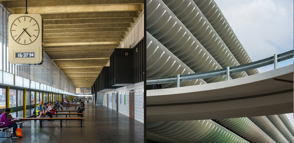 Among the Brutalist buildings that have stood the test of time is Preston Bus Station, built in Lancashire in the north of England in 1969. It was the biggest bus station in Europe at the time, with a multi-storey car park on top behind those rows of soaring fins. All that weight of concrete was offset inside with bright glass and white tiles. A natural element was carefully and deliberately introduced by using the rich tones of African Iroko wood on anything that would be touched by visitors, such as benches, railings and doors. Design geeks will also note the use of Helvetica in the signage.