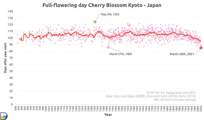 An unusual dataset that I came across online this week – people have been recording the first cherry blossoms in Kyoto for over a thousand years, and while there is plenty of variation, there is no discernible trend until you hit the era of climate change.