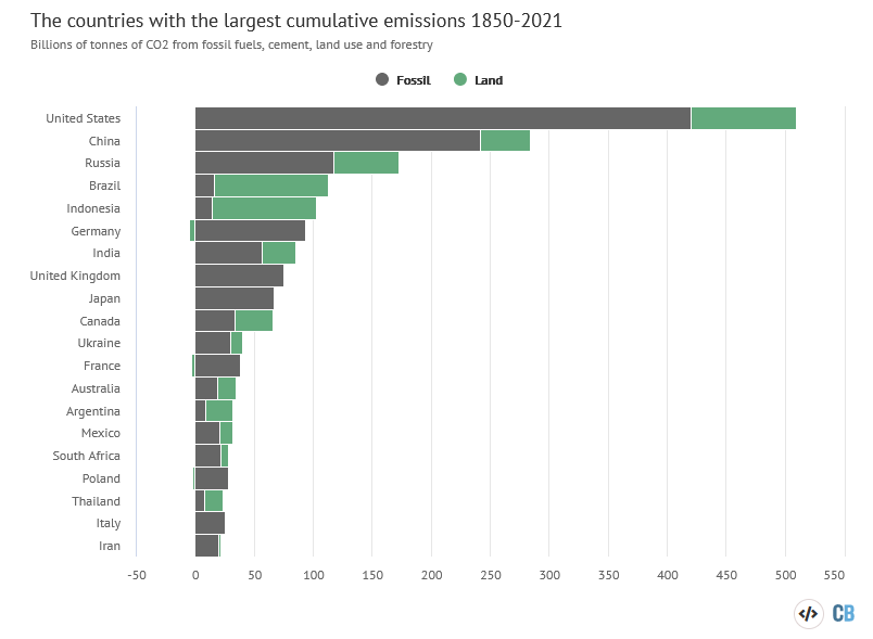 In 2019 Carbon Brief released a very helpful analysis of historic responsibility for climate change. This week they have published an updated version, and it’s worth mentioning it again. An important addition this time is the data on land use, so it includes the carbon impact of deforestation.