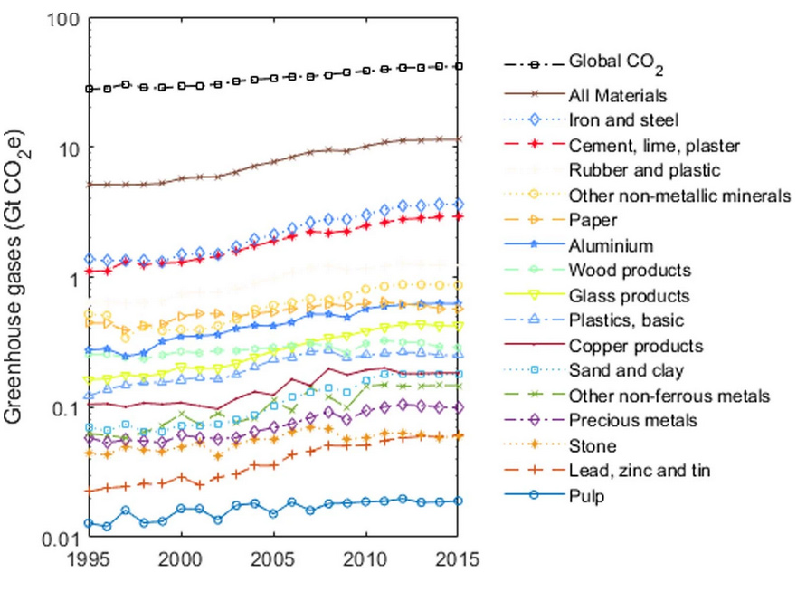 Industry is a major user of energy, much of it for heat, and therefore it is a major source of emissions. Global population is growing, many people are getting wealthier and enjoying more consumer products – and is most contexts that’s a good thing. But everything has an impact, and the carbon emissions of materials are almost all rising: