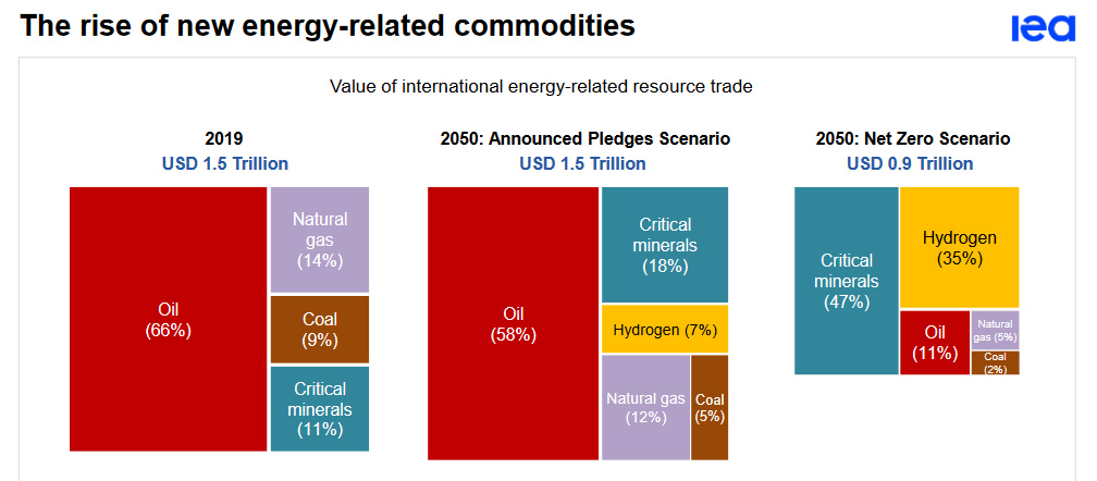 If the world were to pursue a genuine net zero strategy, oil would wither as an industry. The materials for batteries, renewable energy and electrolyers would rise in importance – the ‘critical minerals’ above. All IEA models are to be held lightly, but here hydrogen has a third of energy related resource trade, three times more than oil. This would be a scenario where hydrogen, produced with renewable energy, would indeed have displaced oil.
