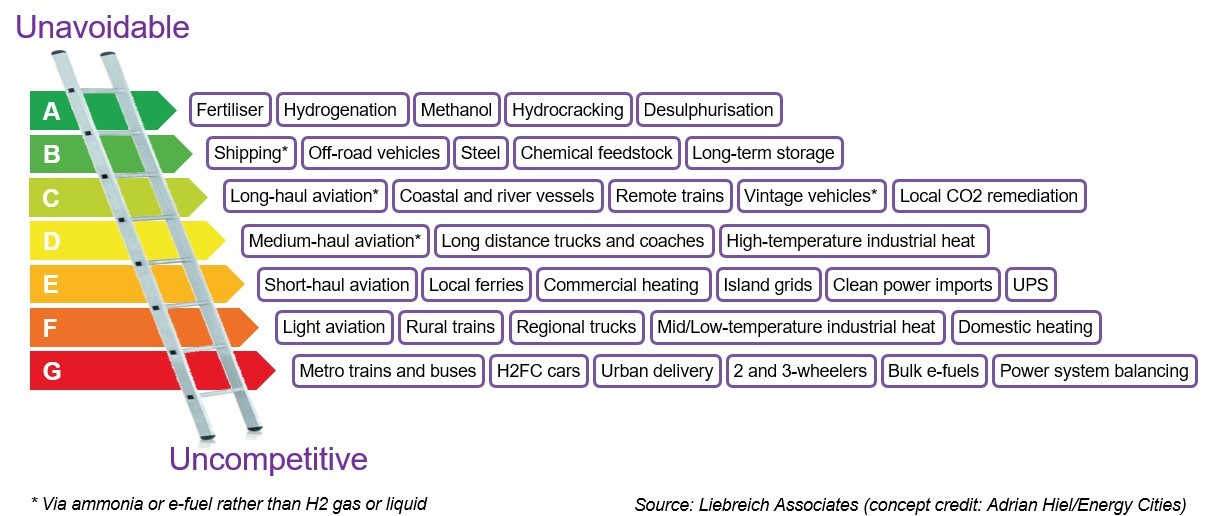 One attempt to sort the economically practical ideas from the rest is this ‘ladder’ from Liebriech Associates, usefully made available on a Creative Commons basis. “Just because you can technically do something with clean hydrogen doesn’t mean you will” says Michael Liebreich, and the ladder grades the various uses according to how competitive they will be.