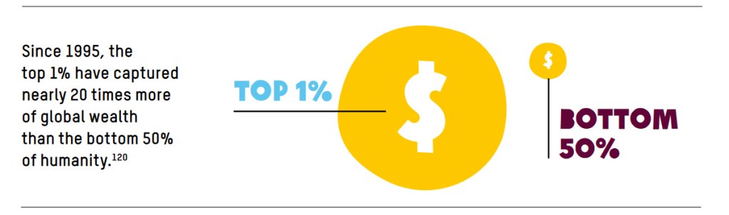 Taken together, Oxfam reports that over the last quarter century, the top 1% have taken home 20 times more wealth than the entire poorest half of humanity.
