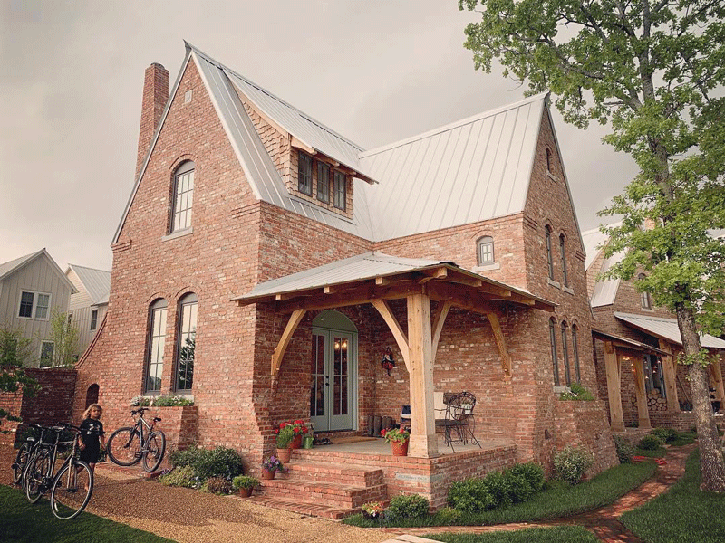 Chapman is reviving the brick construction techniques that were common in the United States before the Second World War, and that have been almost entirely forgotten post-war. They rely on thermal mass to provide insulation, and the basic structure of the building is very solid. The idea is that the brick shell of the house will endure for as many as thirty generations, with the interior re-fitted every once in a while in-between. A metal roof and exposed conduits for utilities make it easy to refit, so there are elements of repair here as well as overall durability.