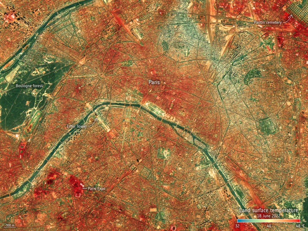 In a warming climate, these stories are increasingly frequent and cities will need to adapt to build resilience to heatwave conditions. New images from the European Space Agency give us a clue about that resilience. Using a heat-mapping tool called ECOSTRESS, the ESA have published high resolution images of land temperatures in three European cities. Here’s Paris, and you can zoom in on a larger version here.