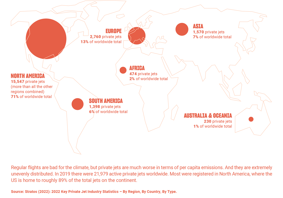 Despite these notable exceptions, the distribution of private jets is firmly tilted towards the global north, and firmly to the United States.