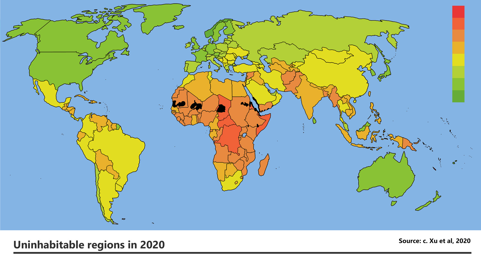 In my presentation on Saturday I used two maps that weren’t in that collection, so I’ve just added them. That’s the projections of uninhabitability from the Xu et al study, which I’ve redrawn to match the rest of the set. I’ve included them below.